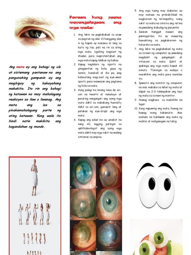 Ang isa pang paraan upang mapangalagaan ang iyong sarili laban sa sakit ay ingatang malinis hanggat maaari ang mga timba lubid at banga na ginagamit sa pagsalok at pag-iimbak ng tubig. Ang mga mahahalagang sustansya na kailangan ng mata upang manatiling nasa mabuting kondisy0n ay ang lutein omega-3 fatty acid zinc vitamin A C at E. Kaya naman ang mga ito ay napaka-halagang organ sa nilalang.