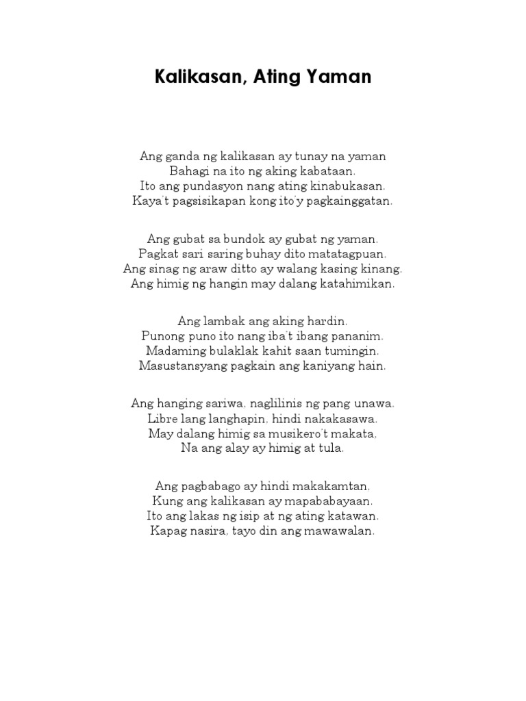 KALIKASAN ATING GINTONG YAMAN Tulang di-malayang taludturan Ikalimang Pangkat Kapaligiran natin Diyos nag-alay Itoy mahalagang bahagi ng buhay. Kalikasan sana kamiy mapatawad mo. Makakatulong rin ito sa mga susunod pang henerasyon sanay masaksihan pa nila ang tunay na kagandahan ng ating minamahal na kapaligiran.